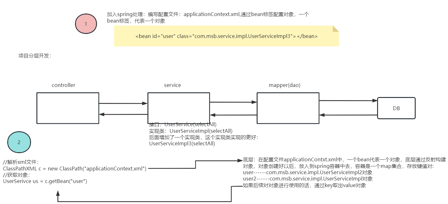<bean id="userService" class="com.xxx.UserService">...</bean>); - 注解(
